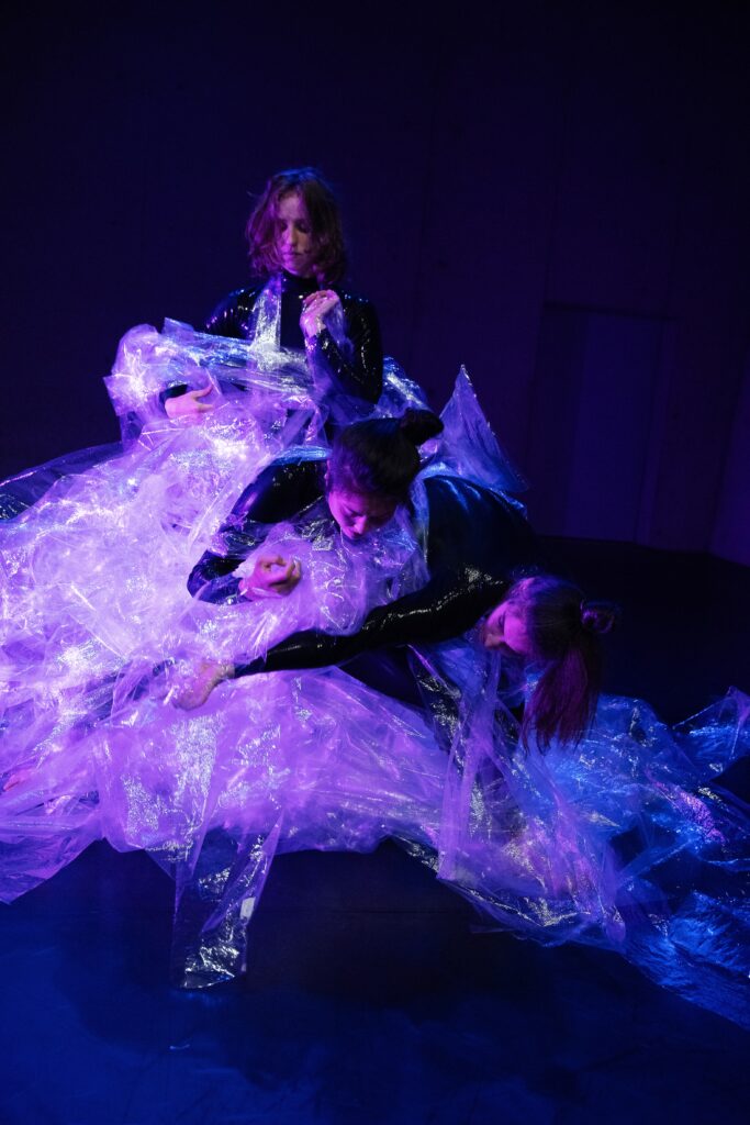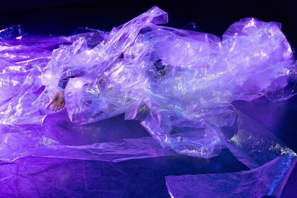 Plastik befindet sich in der Luft, die wir atmen, und im Wasser, das wir trinken, kontaminiert die (Um-)Welt und durchdringt alle Ökosysteme und Lebewesen. living matter(s) erforscht Möglichkeiten der Annäherung an dieses omnipräsente, gleichermassen praktische wie auch problematische Material. Drei Performer:innen waten und kämpfen sich durch eine dystopische Bühnenlandschaft. Gemeinsam versuchen sie in dieser toxischen (Um-)Welt zu überleben, einen Ort der Fürsorge und des Miteinanders zu erschaffen und sich mit ihrer plastifizierten Umgebung zu verbinden. Dabei entstehen unerwartete Verbindungen zwischen menschlichen und nicht-menschlichen Körpern, wuchernde Assemblagen aus Plastik und Haut, hybride Ökosysteme.
